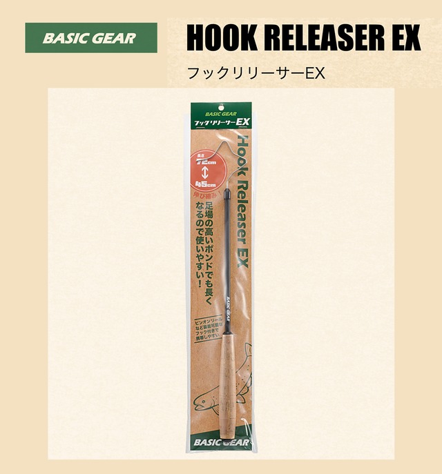 「ベーシックギア/ フックリリーサーEX」 足場の高いポンドでも長くなるので使いやすい!長さ45cmから72cmまで伸び縮みするフックリリーサー。ピンオンリールなど装着可能なフック付きなので携帯しやすく使いやすい! ・全長:45-72cm ・素材:ステンレス(リリーサー部)、カーボン、コルク) ・販売価格:¥ 2300(税抜)
