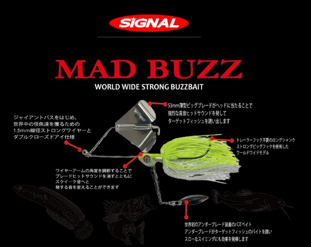ウィードエリアやフローティングカバーからビッグバスをパワーで引き抜く、陸っぱりでビッグなバス達を抜き上げる、ジャイアントスネークヘッドなど世界中の怪魚達を獲るための、汎用性とルアーパワー、そしてストロングな構造、シグナルが世界に送る、超ストロングバズベイト、それが『マッドバズ』 ・LENGTH:160mm 6.3inch (skirt:70mm) ・BODY WEIGHT:1oz ・PRICE:1800円(税別)