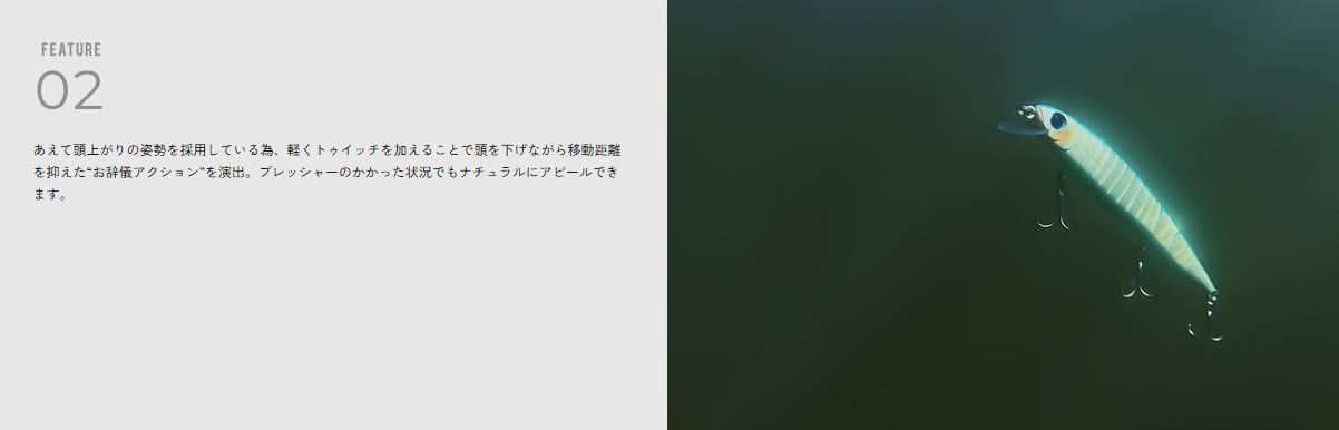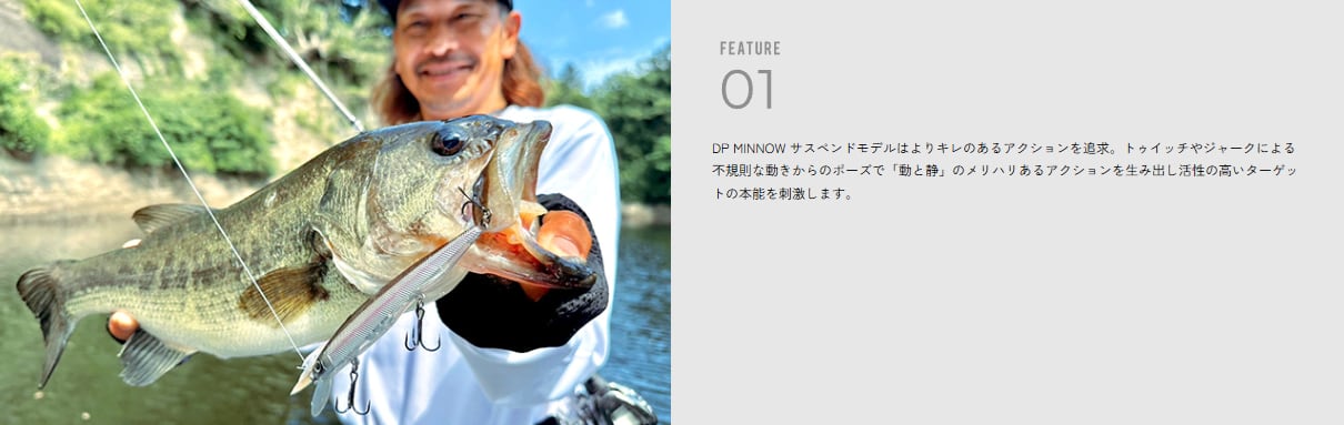 DP MINNOWフローティングモデルからセッティングを見直し、キレとメリハリのあるアクションを追求したサスペンドモデル。あえて頭上がりの姿勢を採用しさまざまなシチュエーションで効果的にターゲットを誘います。