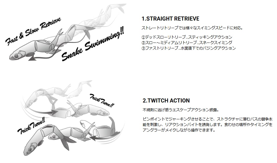 ストッピングの瞬間に発生する絶妙な揺らめき、リトリーブスピードを上げるたび引き起こされるパニックエスケープなど、単純動作を加えるだけで喰わせてしまう驚異の被捕食率が、HASU RAVERの凄いところ。