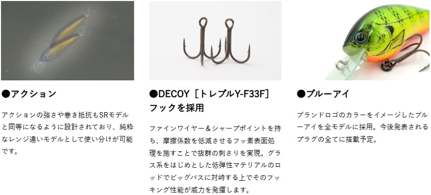水深1.5m前後のブレイク、ハードボトム、インビジブルストラクチャーに絡めたアプローチはもちろん、スローリトリーブでもしっかりアクションする特性を生かして、あえてシャローボトムをスローにトレースするなど、SRモデルとMRモデルのコンビネーションによって多彩なアプローチが可能になりました。
