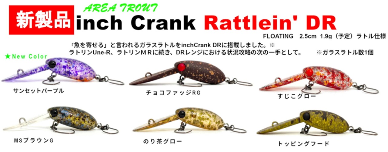 「魚を寄せる」と言われるガラスラトルを inch Crank Rattlein’ DR に搭載しました(ガラスラトル1個) ラトリンUne-R、ラトリンMRに続き、DRレンジにおける状況攻略の次の一手として。