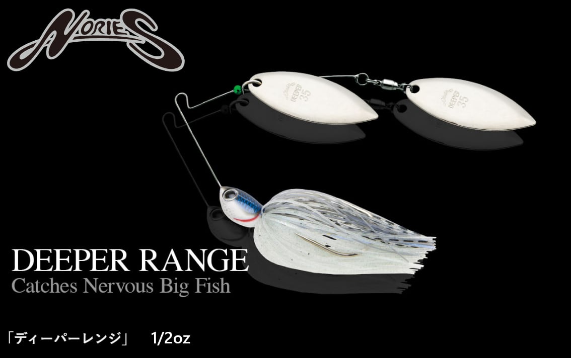 メジャーレイクの警戒心を高めたビッグバスを捕らえるために、やや強さを抑えた「ディーパーレンジ」。一般的にスピナーベイトの強さを抑える場合、ブレードを減らしたりサイズを下げてバイブレーションを小さくする手法が取られますが、これでは同時にフラッシングまでも失ってしまいます。それに対してディーパーレンジはブレードサイズを下げることなく独特なベンディングワイヤーセッティングでそれを実現。ナーバスなバスに接近するまでは驚かせないタイトバイブレーションでありながら、バスの攻撃範囲ではリアクションを誘うフラッシングを両立しています。さらにこのベンディングワイヤーのブレード抑制効果は、通常スピードのリーリングでワンレンジ下を平行引きできる、浮き上がりにくいバランスをも獲得。ネーミングの由来であるより深い(ディーパー)レンジを攻略できるベイトとして、クリアに限らずマディウォーターでも優れています。
