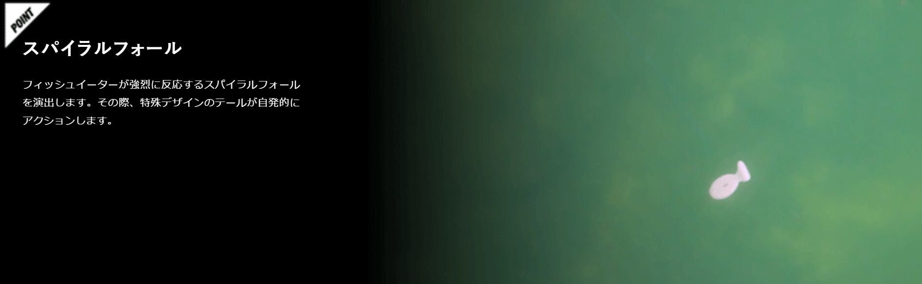 フィッシュイーターが強烈に反応するスパイラルフォールを演出します。その際、特殊デザインのテールが自発的にアクションします。