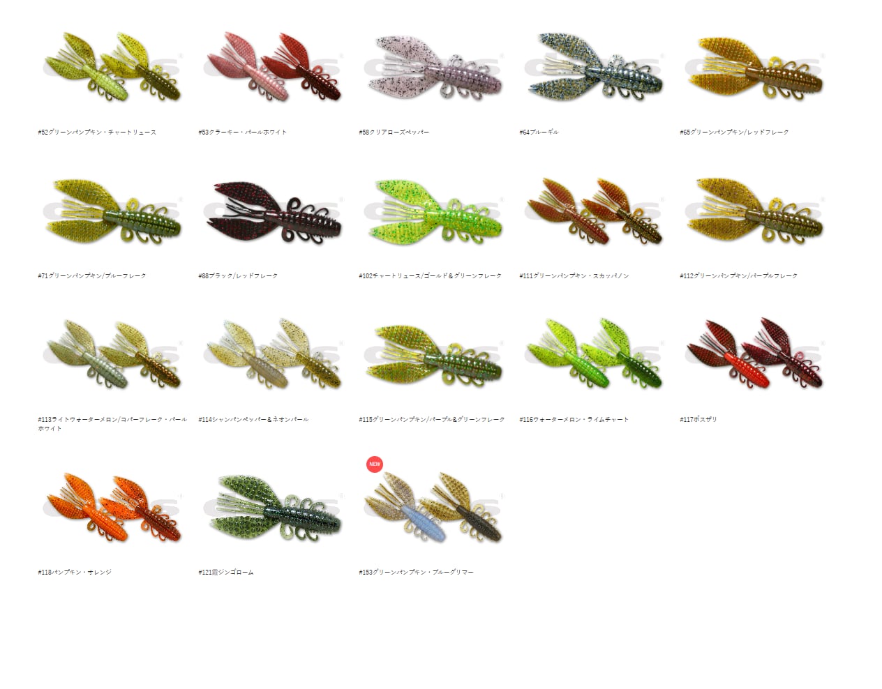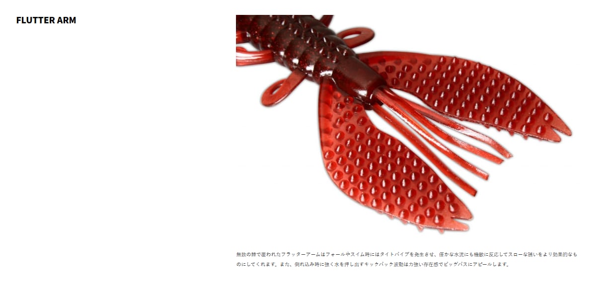 中空エアホルダーを設けたファットボディと、フォール時やスイム時にタイトバイブをみせるフラッターアームに棘をまとったスパイニークローは、ボディ全体で水に絡みつく無数の棘が放置メソッドでの自発的アクションと群を抜く存在感でバスにアピールします。