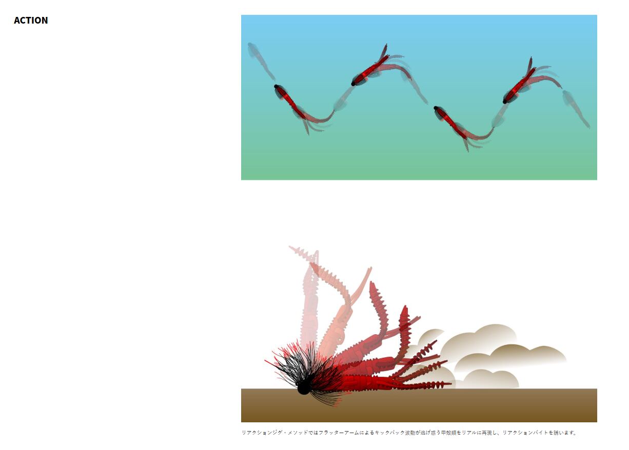 さらにボディ頭部にエアを含みながら倒れ込むときに見せる、力強く水を押すキックバック波動はビッグバスに強烈な威力を発揮します。