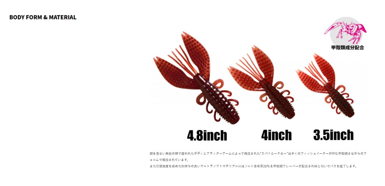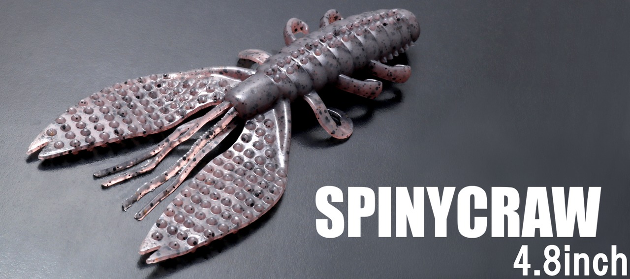 中空エアホルダーを設けたファットボディと、フォール時やスイム時にタイトバイブをみせるフラッターアームに棘をまとったスパイニークローは、ボディ全体で水に絡みつく無数の棘が放置メソッドでの自発的アクションと群を抜く存在感でバスにアピールします。