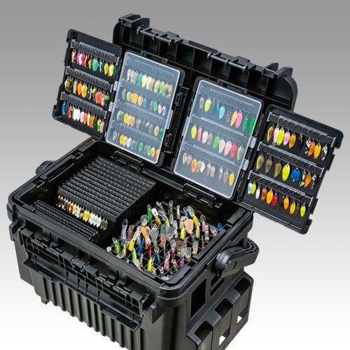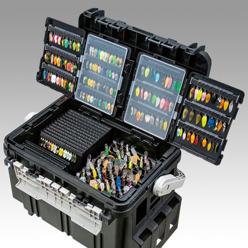 本体となる中皿部分は十分なスペースと深さがあるので、使用頻度の高いケースを大量に収納できるサイズ感なので、中皿を外してBOX本体に収納しているケースを取り出す手間が軽減します。更に、別売の「プラグハウス」や「フラップボード」を設置することで、最大限に収納容量を膨らませながら、取り出しやすさを実現するなど、手数と手返しを重視するエリアトラウトに特化させたシステム収納です。
