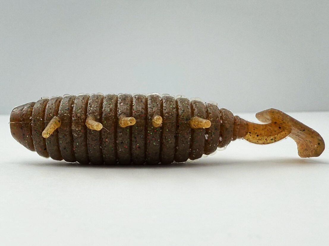 エビシャッドから受け継いだ手がフォールやズル引き時に震え、釣れる微振動を発生。水平につけられたスクエアテールは水を受けて落ちる時に水押しを強調。アクション時においても、動いたり、動かなかったりとエビシャッドから受付継いだ意図しないイレギュラーな動きが釣れる要素になっています。高比重ノーシンカーにとって重要な水押しの定番ボディだけでなく独特なテールで抜け押す水押しを付随させました。