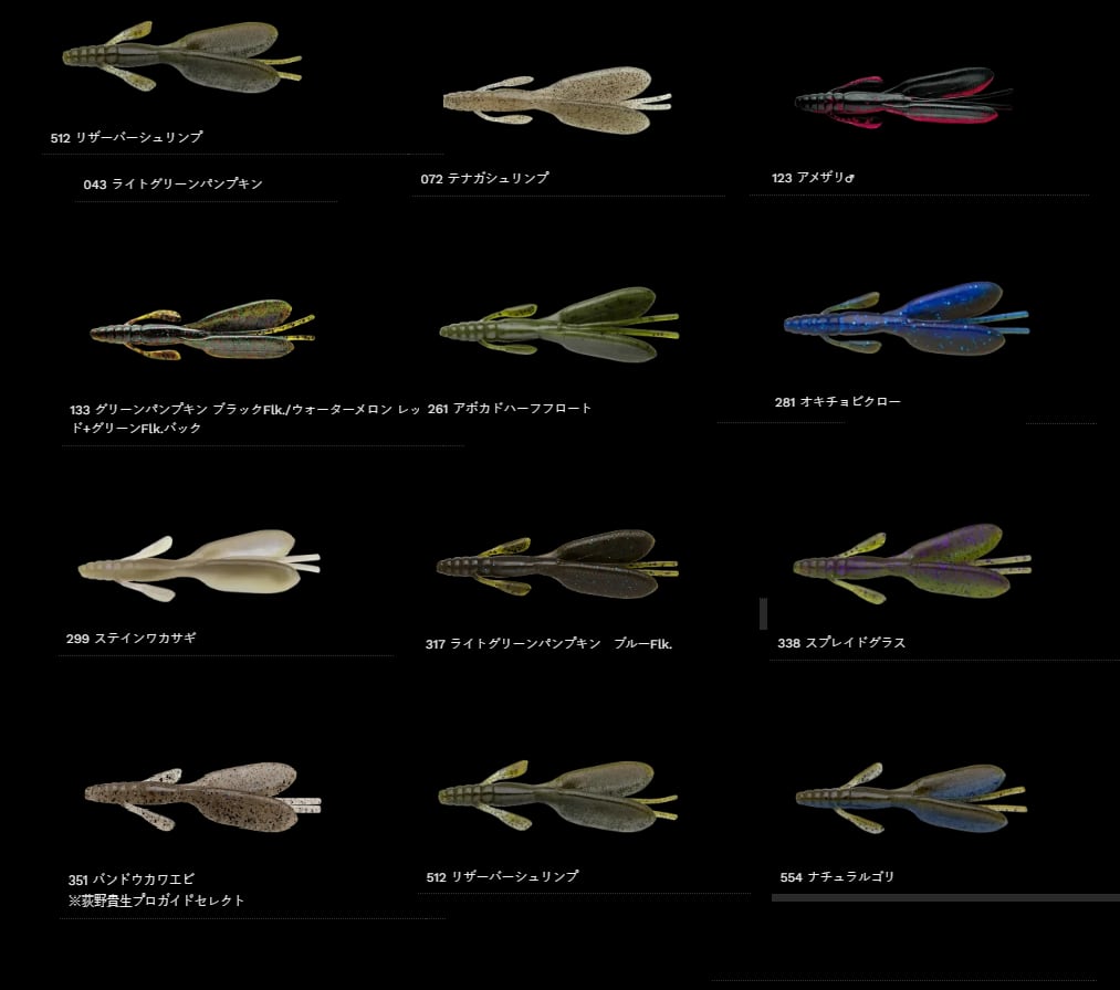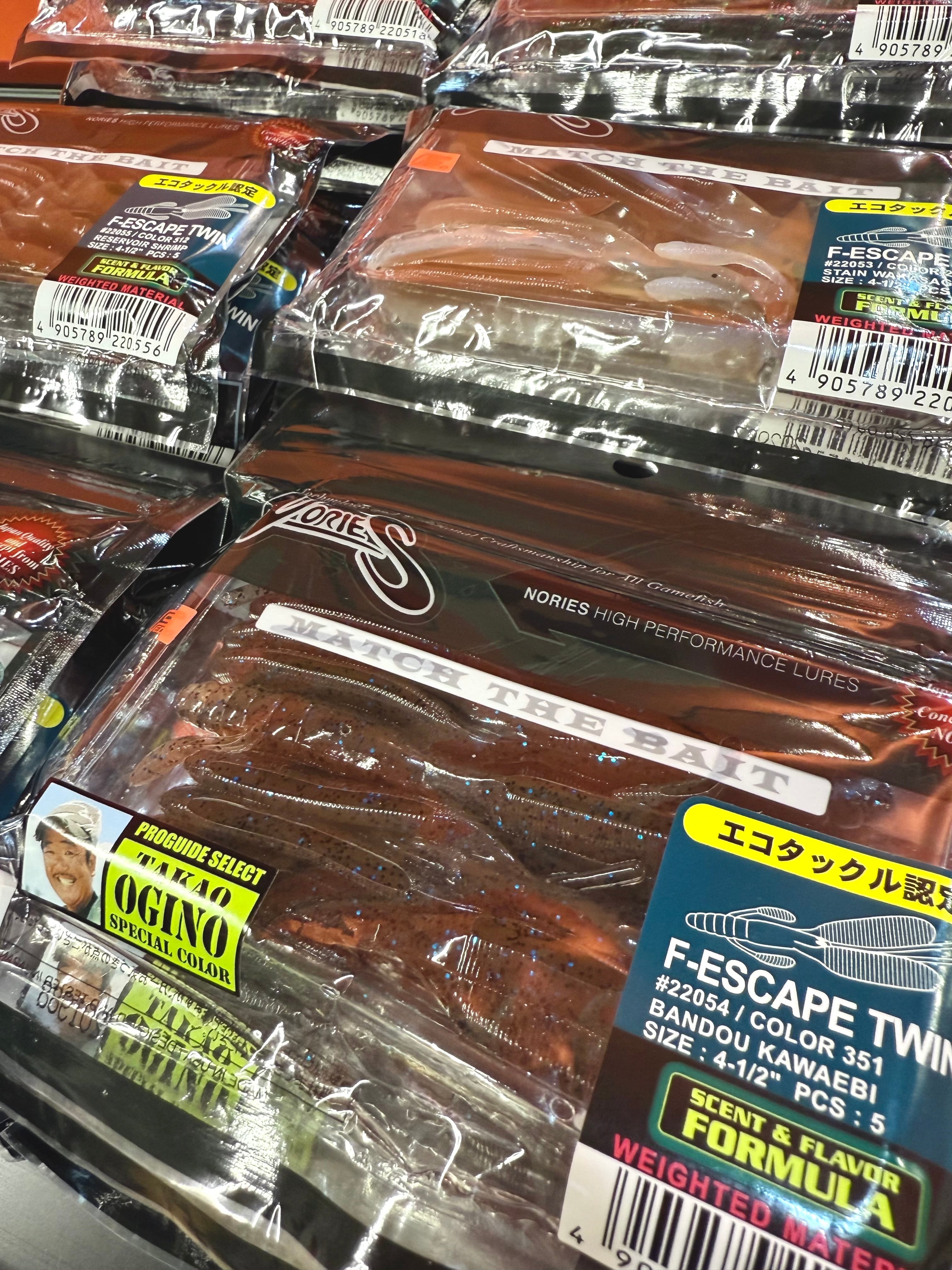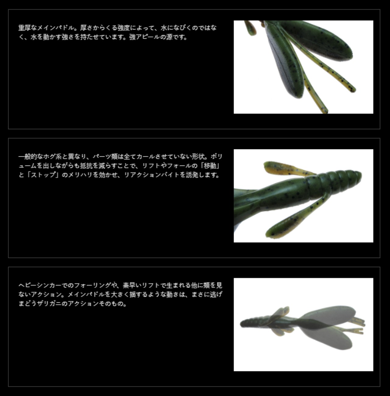 メリハリの効いた動きに、ボリュームによる“強い”アピール効果を持たせたのが「エスケープツイン」ボリュームアップした各パーツは全てストレート系水押し形状。これによりフォールやリフトなどではスパッと動いてリアクションを誘い、着底の瞬間やシェイクでは各パーツが水を大きくかき乱し、強い存在感でアピールします。中でも特徴的な2枚の分厚いパドルは、アクション中はもちろんフォールやただ巻きでも上下に大きくウォブリングして他に無いアピールを見せます。全体としてのシルエットは標準的なザリガニに合わせた喰わせサイズ。高比重素材に混ぜ込んだ塩と、味と匂いの粒子がさらに喰い込みを確実にします。使い方は杭やブッシュなどのカバー直撃テキサス。ブレイクやハンプ狙いのキャロライナ。ビッグフィッシュ狙いのラバージグトレーラーとしてもベストマッチ。勝負の早い”強い”ソフトベイトの釣りに欠かせないワームです。