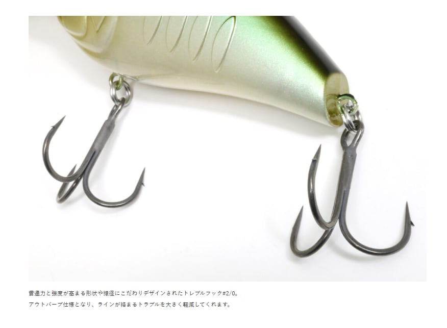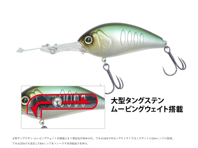 フロロ20lbでも8mレンジに到達する急潜航姿勢は、長くディープレンジをトレースすることができ、フックがリップやボディに隠れ、ストラクチャーにコンタクトしても浮力も相まり、根掛かりによるロストを軽減してくれます。