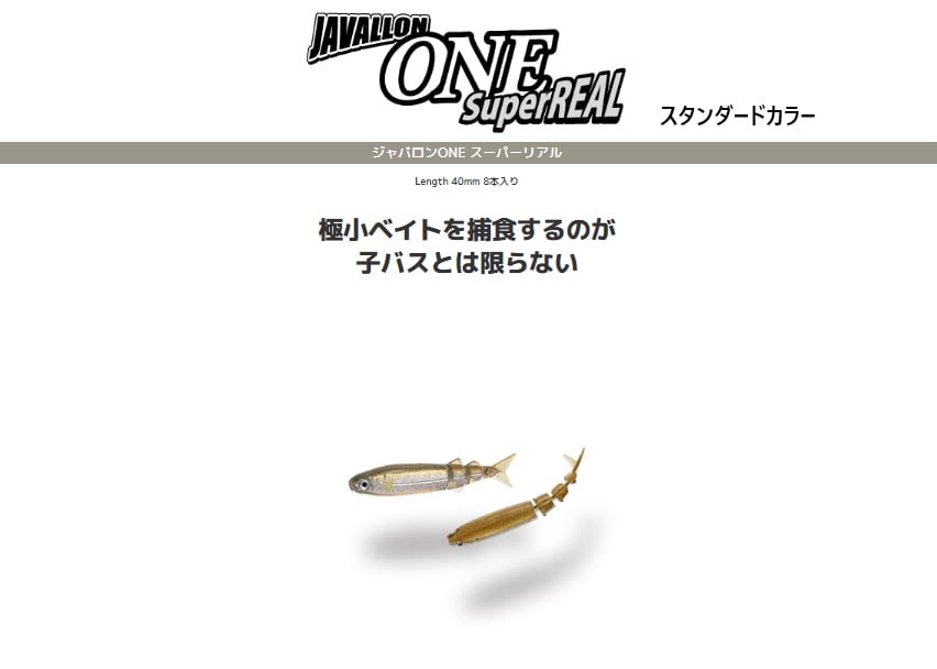 40ミリの極小サイズジャバロンを実現可能にした精密成型に精密塗装とリアルな目玉を搭載。サイトフィッシングにライブサイトに活き活き泳ぐマイクロベイトの究極解が「ジャバロンONEスーパーリアル」です。