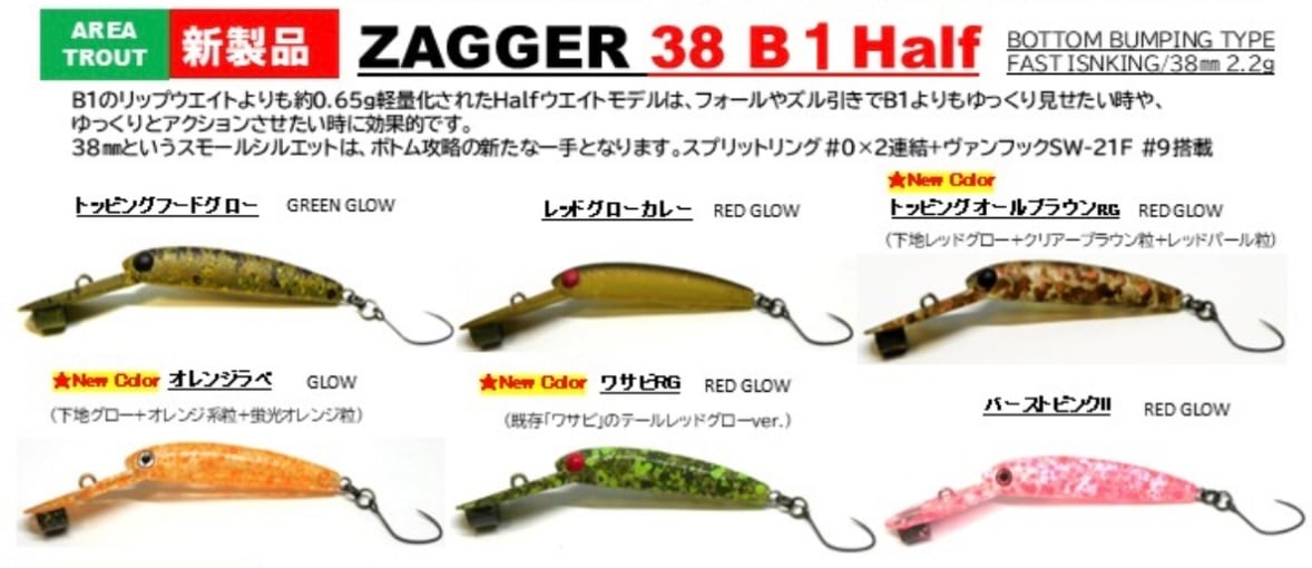 B1のリップウエイトよりも約0.65g軽量化されたHaifウェイトモデルは、フォールやズル引きでB1よりもゆっくり見せたい時や、ゆっくりとアクションさせたい時に効果的です。38mというスールシルエットは、ボトム攻略の新たな一手となります。