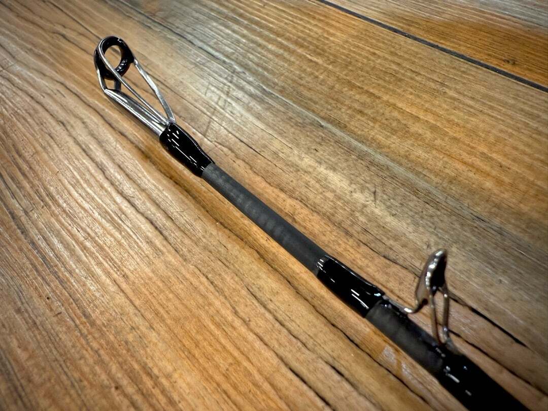 ガイドは、ナイロンやフロロラインの50lb直結の他、PE100lb+リーダー120lbの使用までを想定し、チタンフレームのガイドをフロント部に使用。手元のガイドは、強度を優先しステンレスのダブルフックガイドを使用しました。