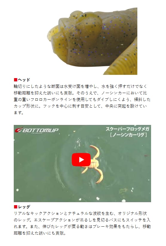 浮力と耐久性に富むエラストマーを採用。レッグのレスポンスが鈍るメガサイズでもイキイキとしたアクションを生む素材硬度を選択しています。