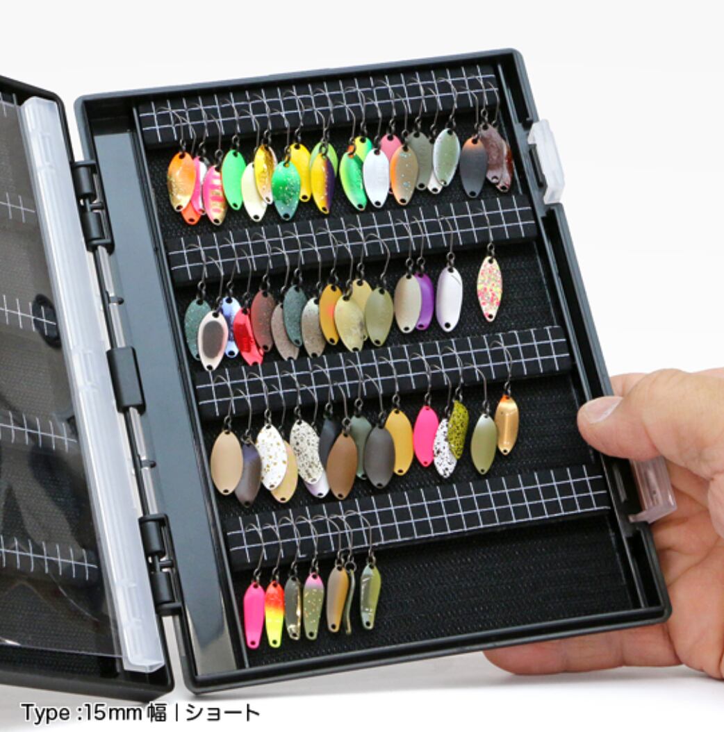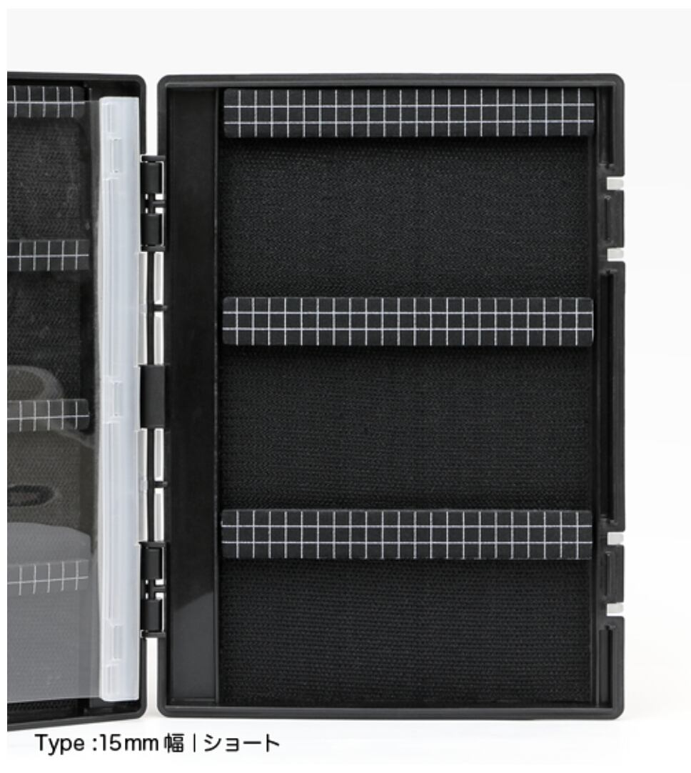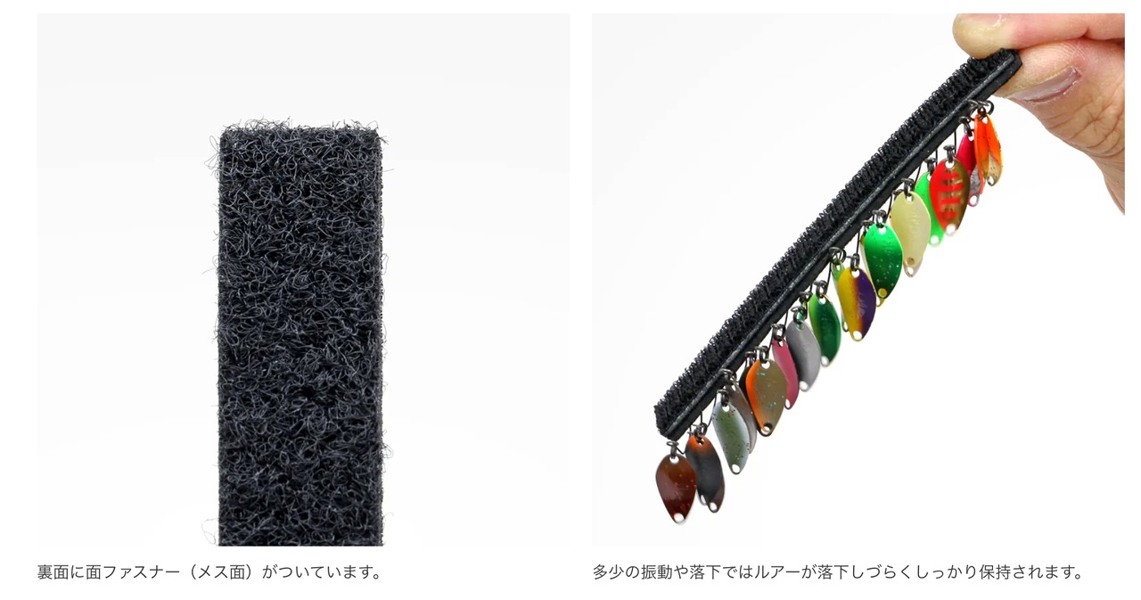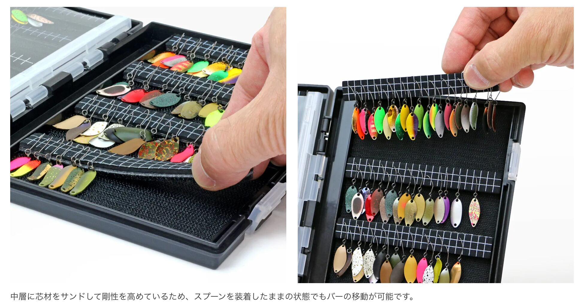 バーの中層に芯材をサンドして剛性を高めているため、スプーンを装着したままの状態でもバーの移動が可能です。収納面は、針の抜き差しを繰り返しても針跡が残りにくく、保持力とスムーズに抜ける操作性を兼ね備えた素材を採用しています。ボックスが強く振られる状況や、誤ってバーを落としてしまった場合でも、ルアーが落下しづらくしっかり保持されます。