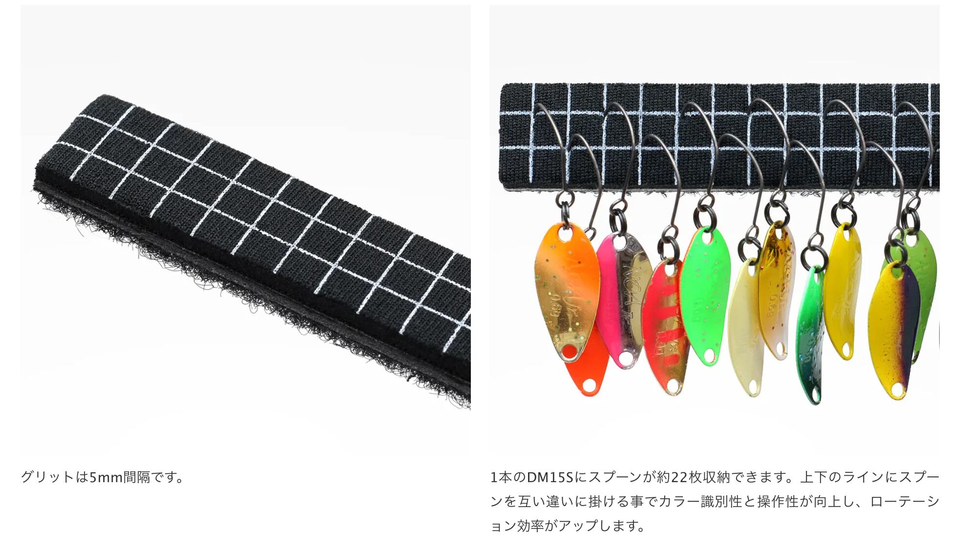 15mm幅のDM15Sには、横ラインが2本入ります。上下のラインにスプーンを互い違いに掛ける事で、スプーンの重なりを抑えられるので、更にカラーを識別しやすくなります。また、フックをつまむスペースが確保されてローテーション効率もアップします。