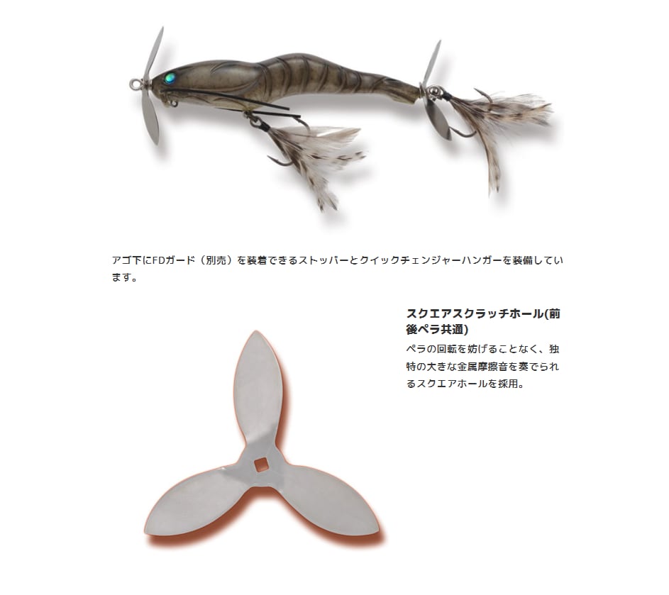 今までのダブルスイッシャーとは違い、前ペラで発生した水流をそのまま後ペラで増幅。前後一体の水流波動を発生させることで抜群の集魚効果を発揮すると共に、バスに違和感を与えず口を使わせる。