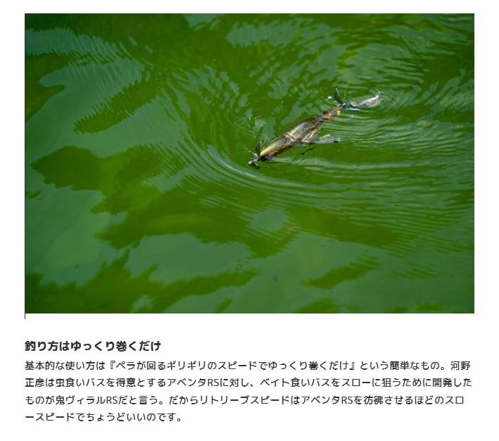 ハンプバックした独特のエビ腰形状でしっかりと水を押し。明確なV字引き波とノイジー螺旋パワーを発揮します。
