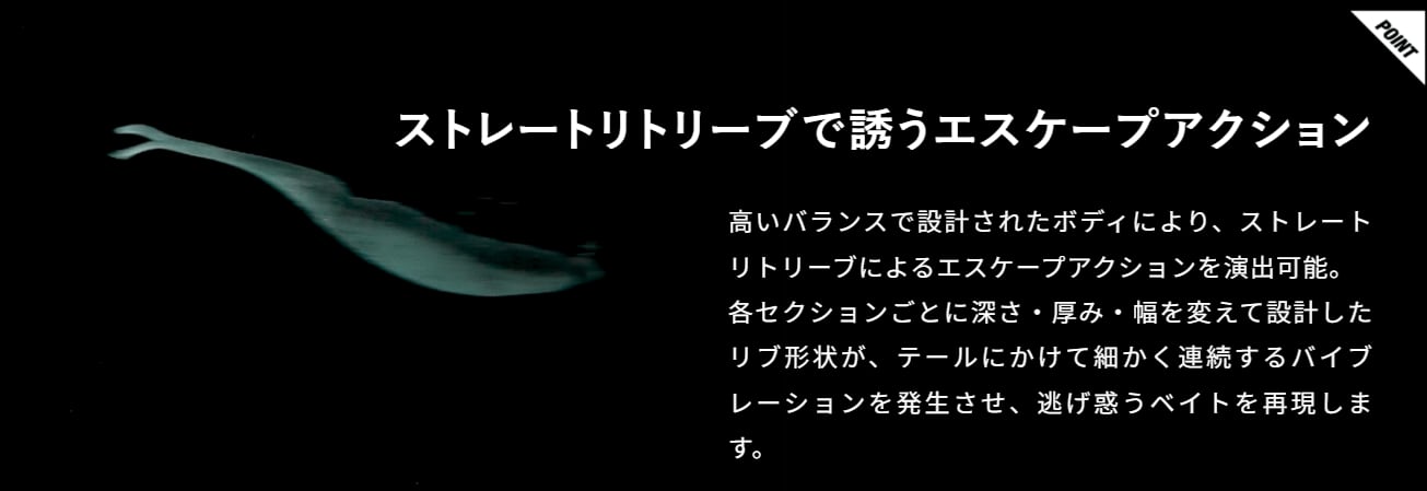高いバランスで設計されたボディにより、ストレートリトリーブによるエスケープアクションを演出可能。各セクションごとに深さ・厚み・幅を変えて設計したリブ形状が、テールにかけて細かく連続するバイブレーションを発生させ、逃げ惑うベイトを再現します。