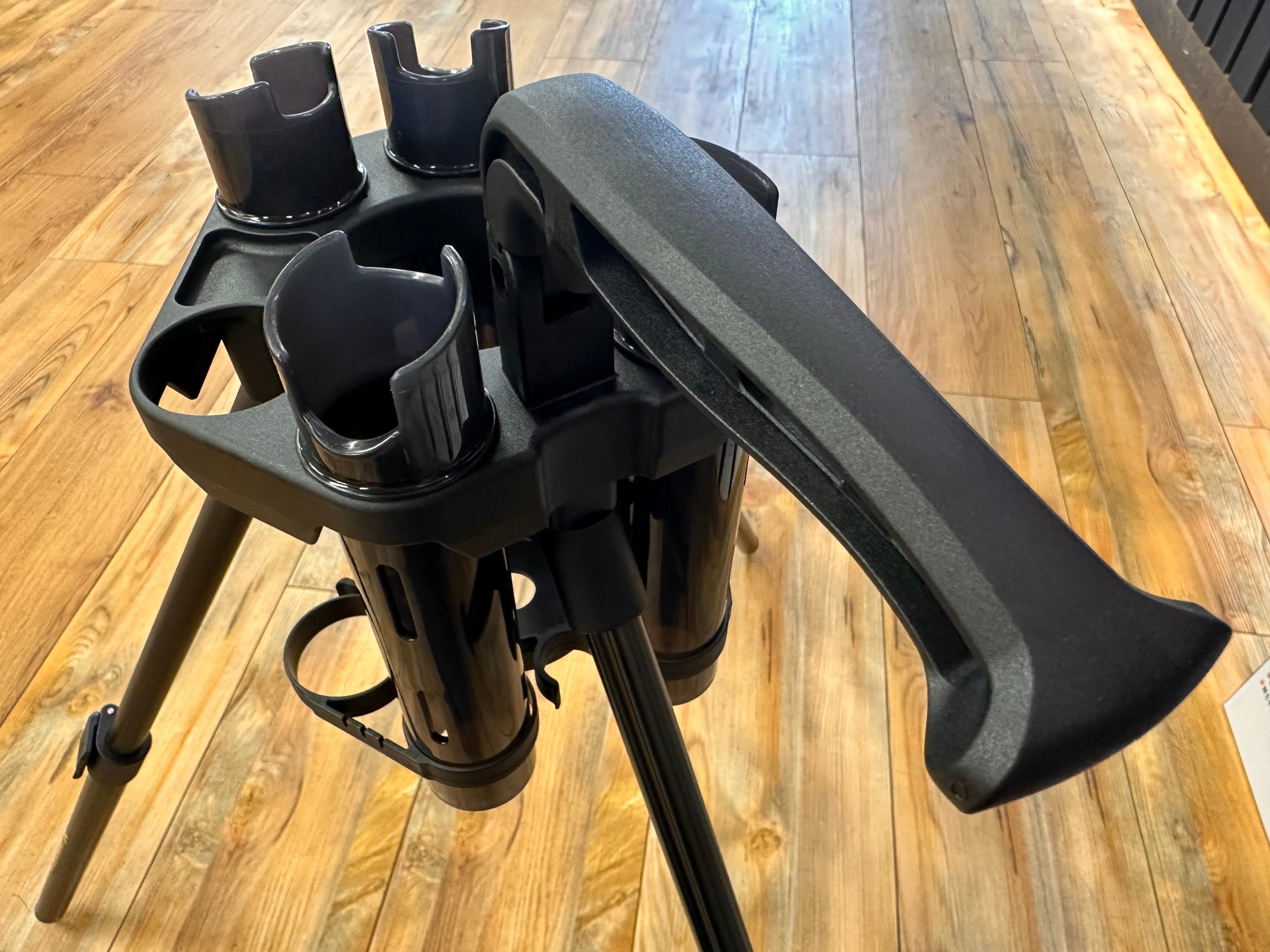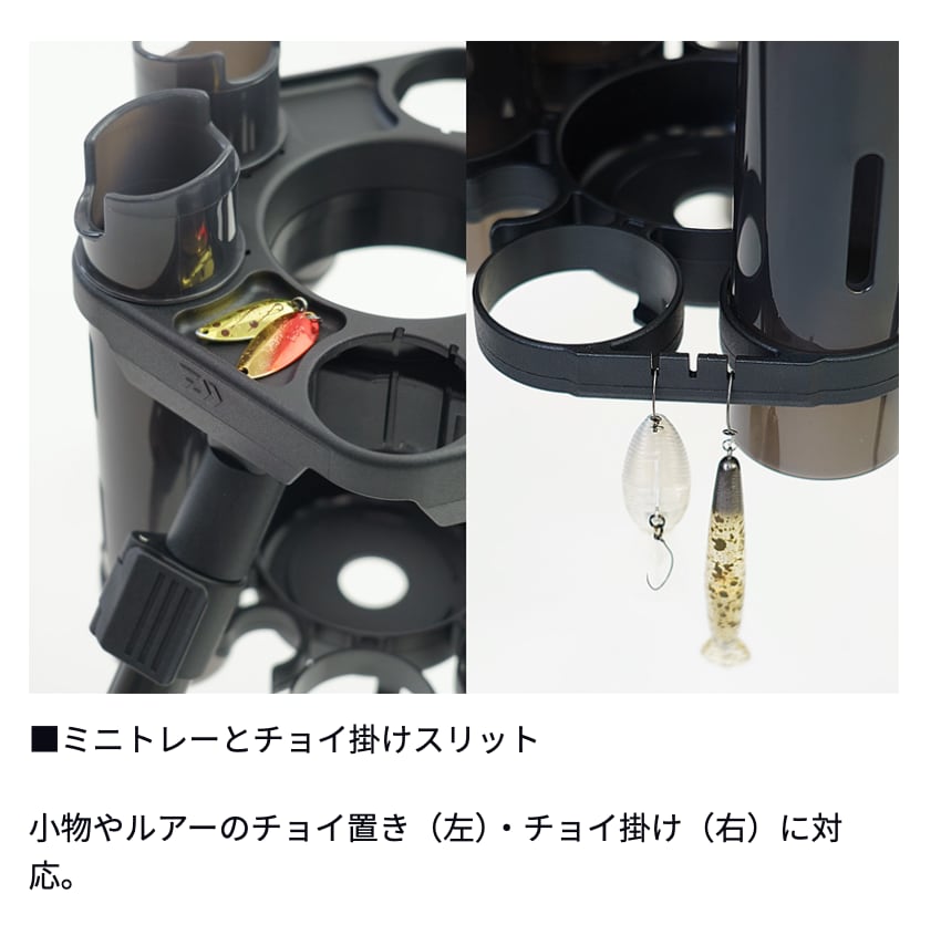 標準でロッド4本、プレッソロッドスタンドαブースターキット(別売り)追加で最大6本まで拡張可能。タックル同士の干渉を極力抑える円形放射状配置。