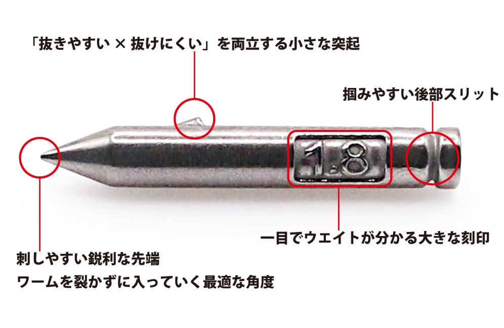 指で簡単に装着・交換できる高性能ネイルシンカー。 先端角度を最適化し、ワームへスムーズに差し込み可能。 表面積を小さくして重量効率をアップ、姿勢も安定。 後部スリット付きでリグチェンジもラクラク!