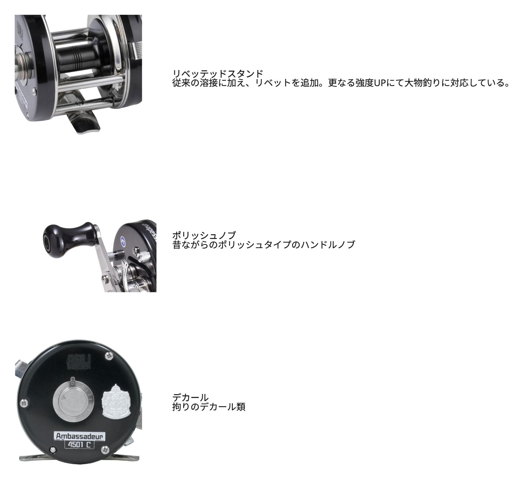 ABU歴史の転換期(80年代前後)に量産された黒色の山型サイドカップに黒銀ステッカーモデルを忠実に再現。古き良き時代の雰囲気を持ち、アップグレードされた内部機構で ユーザーへ満足感と優越感を与える。