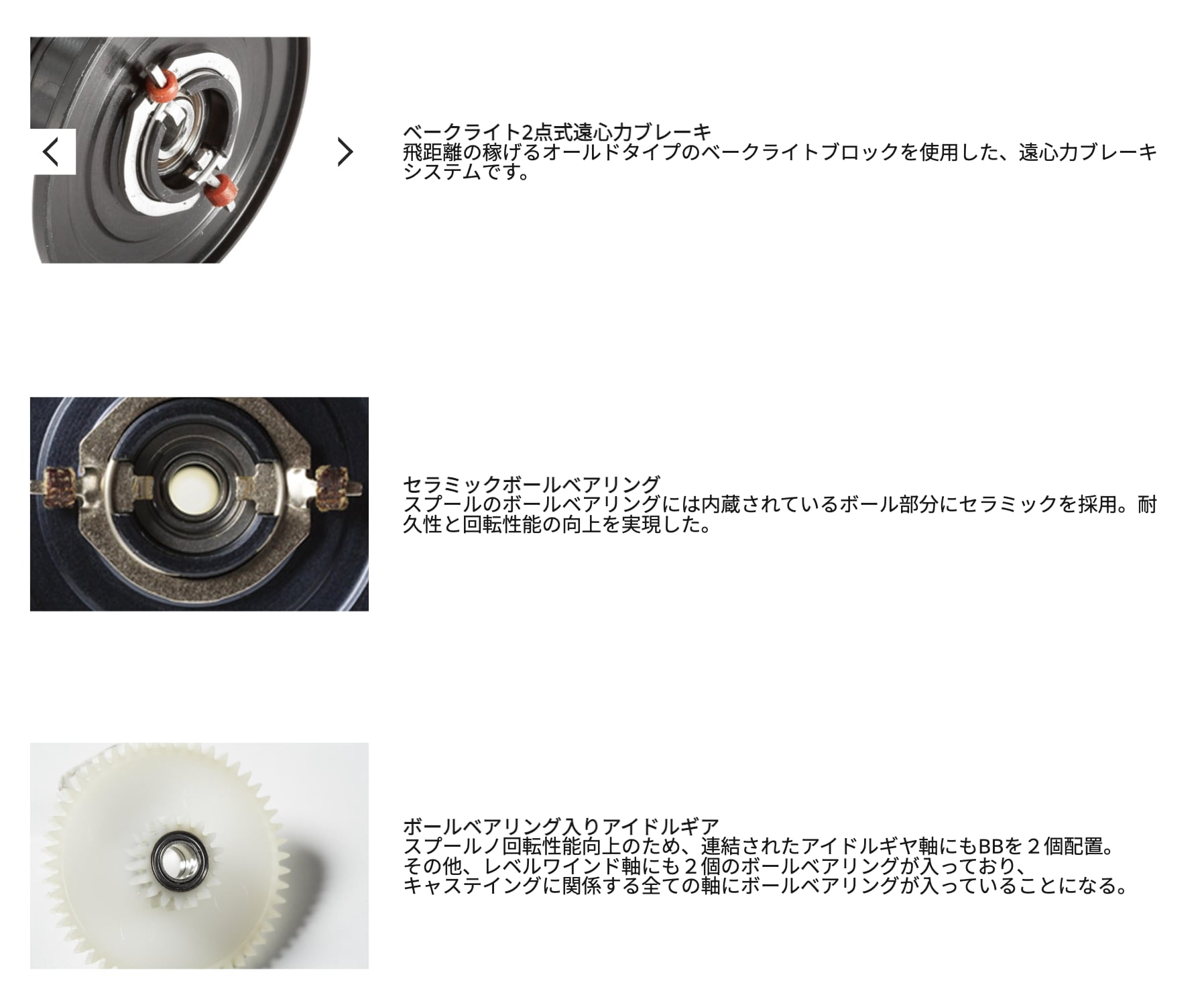 その他、レベルワインド軸にも2個のボールベアリングが入っており、キャステイングに関係する全ての軸にボールベアリングが入っていることになる。