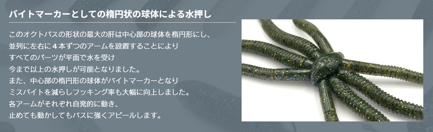 また、中心部の楕円形の球体がバイトマーカーとなりミスバイトを減らしフッキング率も大幅に向上しました。各アームがそれぞれ自発的に動き、止めても動かしてもバスに強くアピールします。