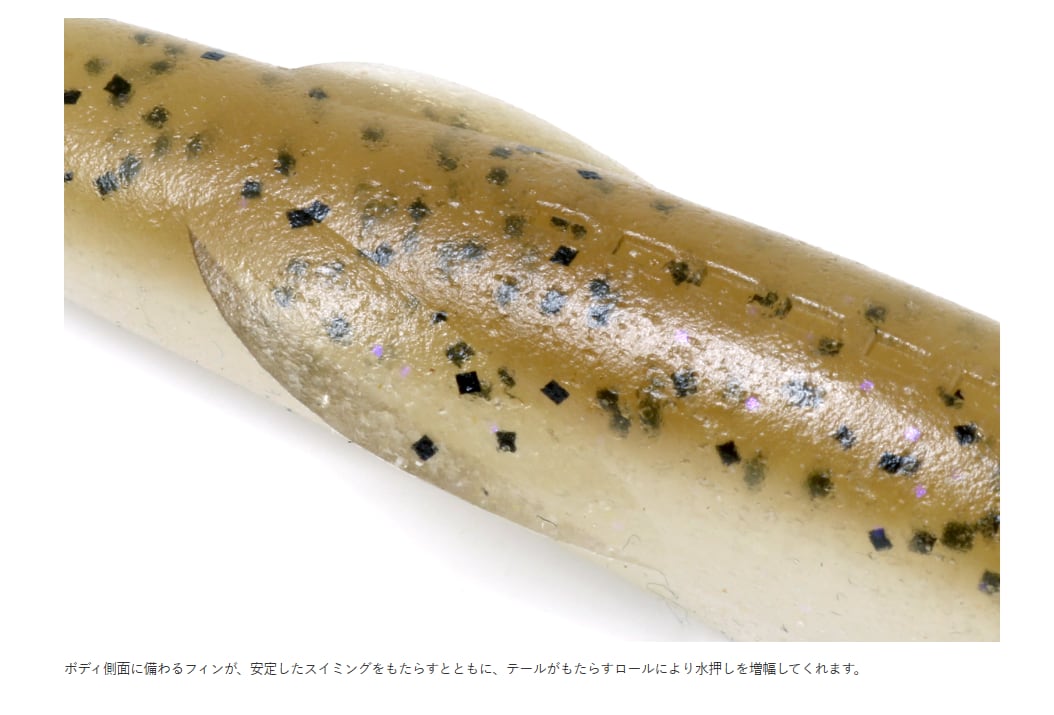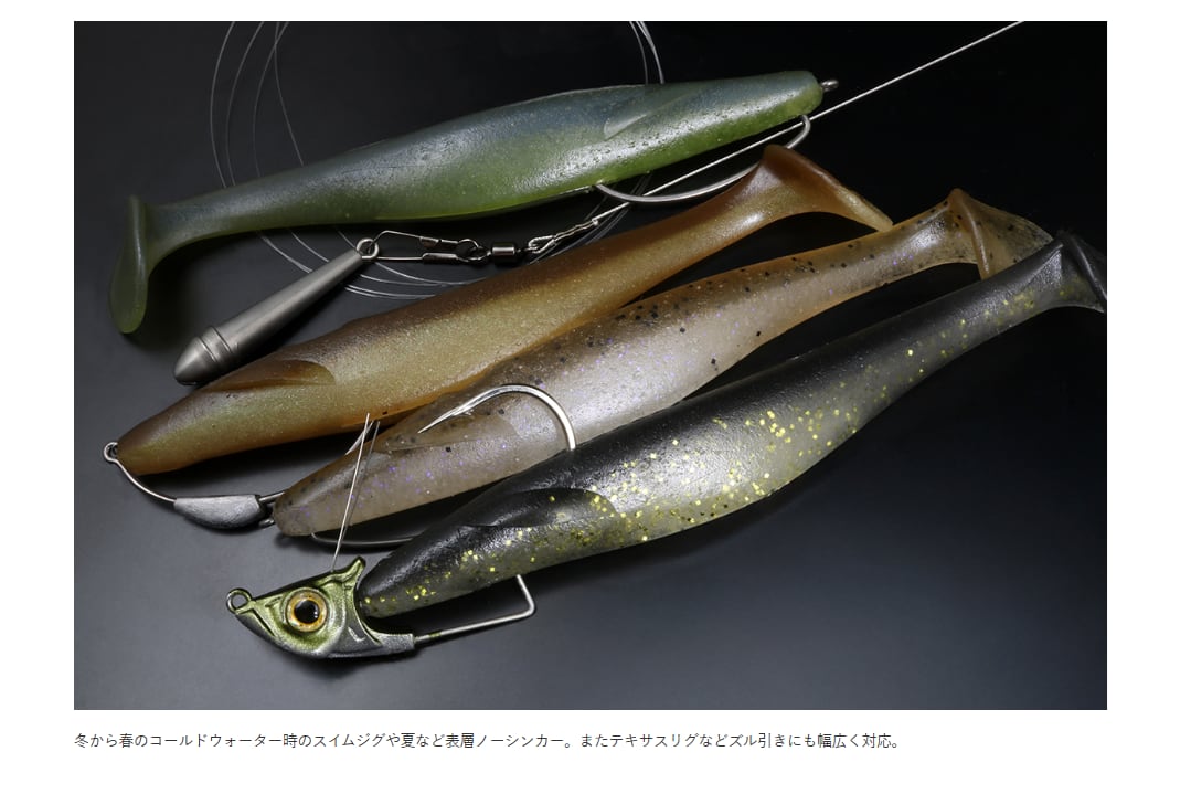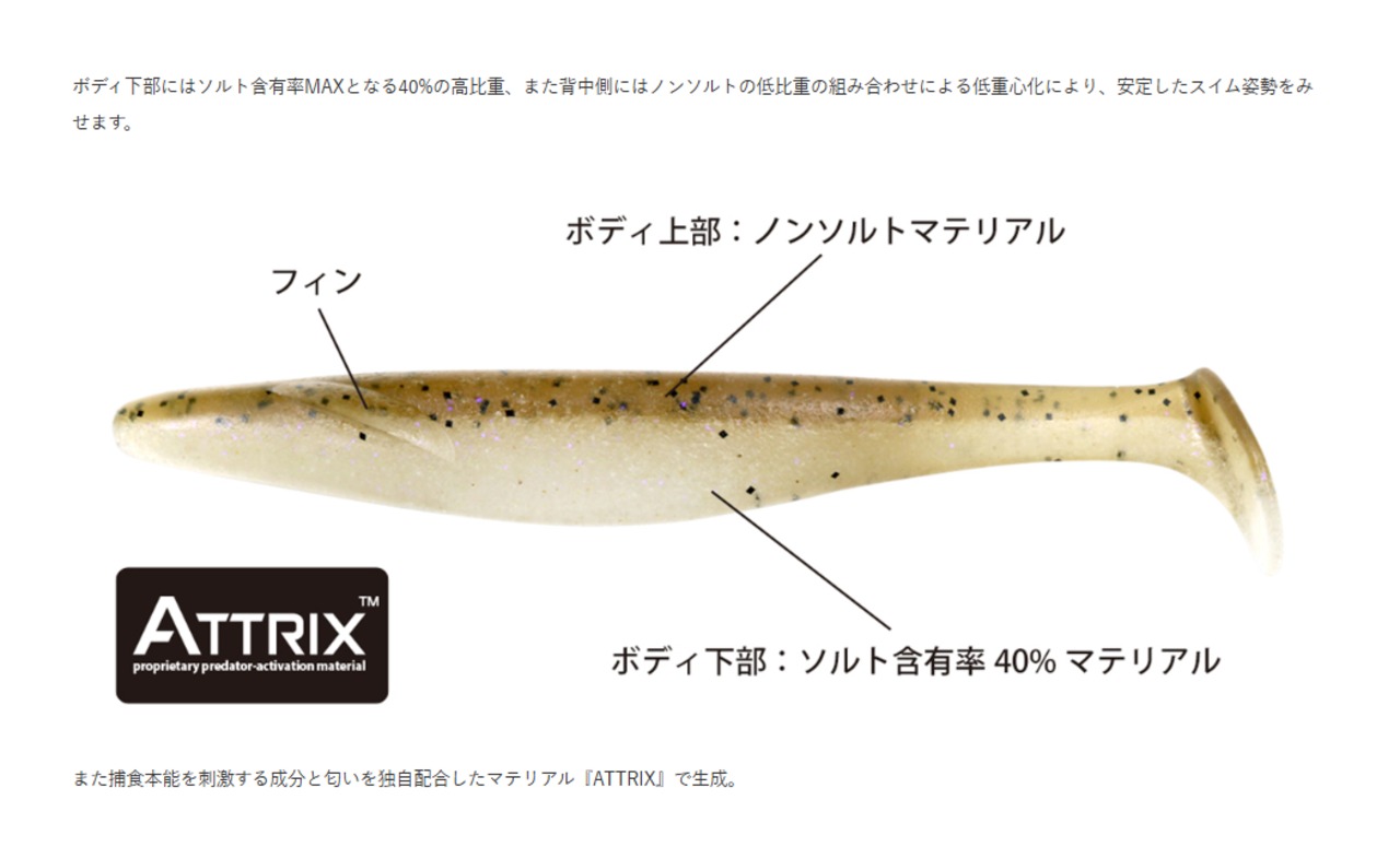 ソルト含有量マックスとなるボディ下部マテリアルによる低重心、また水掴みが良くスローからファストリトリーブまで対応のシャッドテールによる安定したスイム姿勢は、ノーシンカーやスイムジグトレーラーのスイミングはもとより、テキサスリグのズル引きなどレンジコントロールがし易く幅広いストライクゾーンを持ち備えるシャッドテールです。