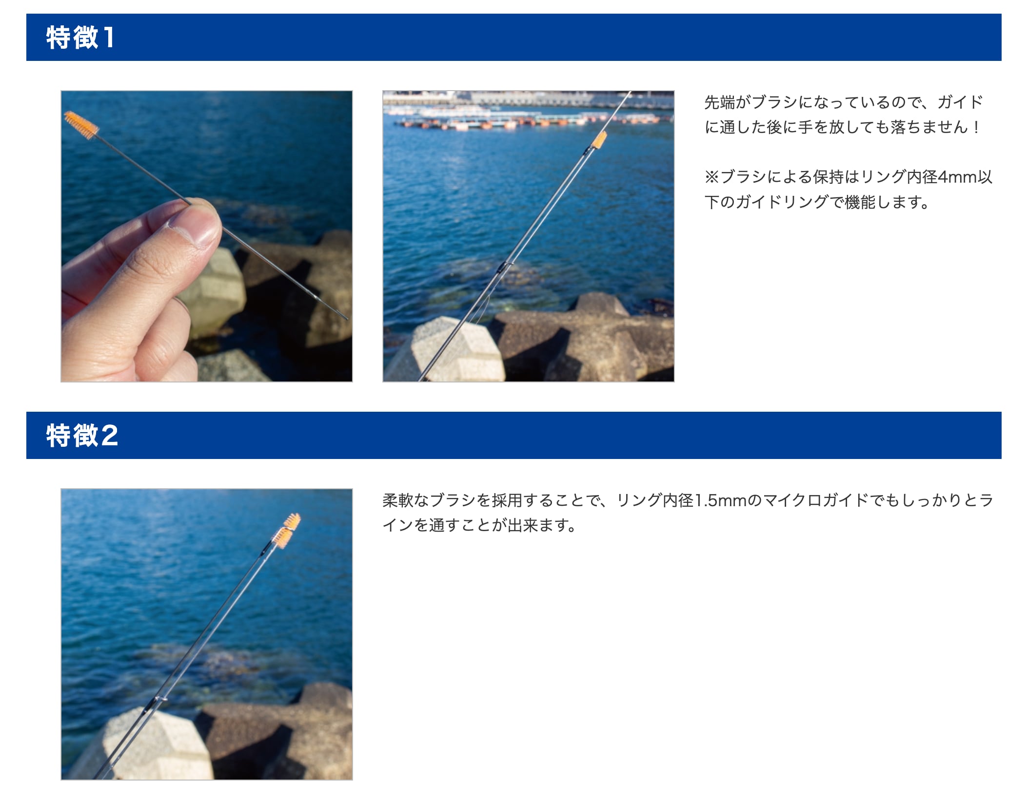 内径1.5mmの極小ガイドにも対応し、0.3号の細いラインでもしっかりホールド。
