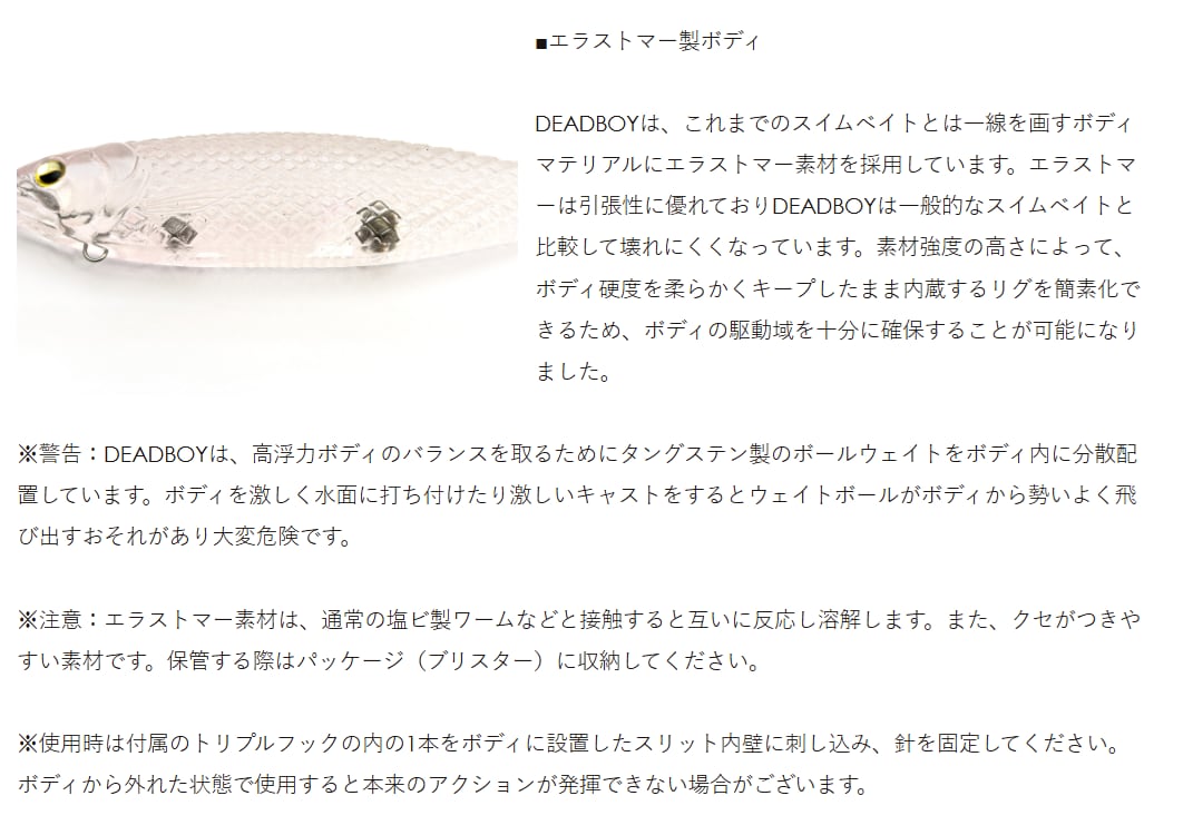 DEADBOYは、超低速リトリーブによって真価を発揮するデッドスローリトリーブ専用スイムベイトです。