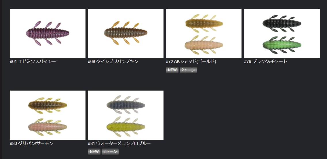 シンプルかつ、爆発力のあるのワームです。高比重マテリアル、流線型ボディにより驚異的飛距離が得られます。ボディの細い方からオフセットフックをセットして下さい。ノーシンカーでは脚をピリピリ動かしながら水平気味にフォールします。ボディの太い方にネイルシンカーを装着すると、バックスライドセッティングとなります。