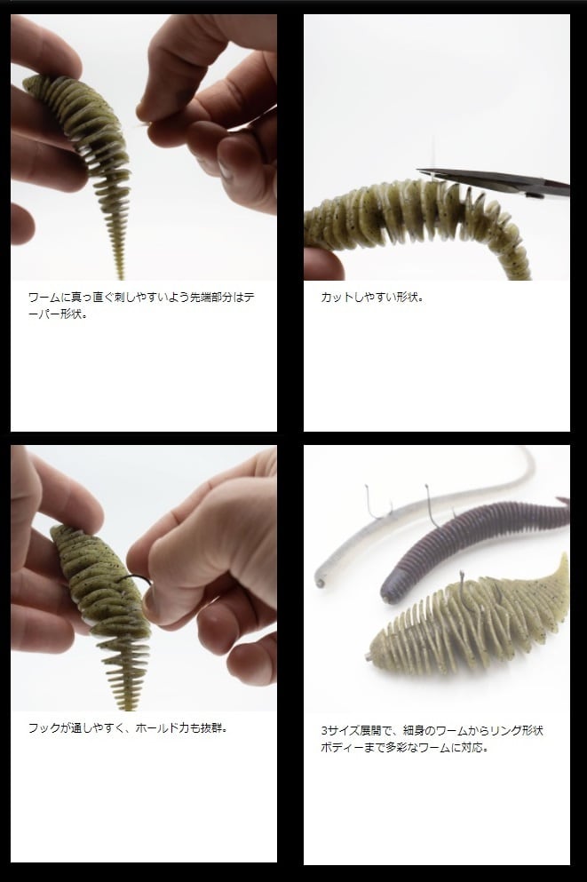 使い方はいたってシンプル。ワームに刺して!先端部分をカット!フック通したらセット完了!ワームに刺しやすいよう先端部分はテーパー形状になっております。先端形状を先細り、伸ばしたことで狙った位置にまっすぐさせるようにしております。