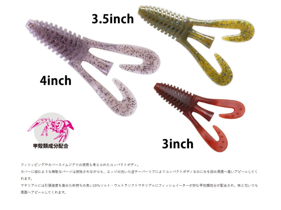 一見シンプルなデザインだが、ボディには水を掴み纏うエッジの効いた逆テーパードリブ、ショートレンジやスローなアクションでも水を掴み良く動くテール、センターテールは小刻みに揺れる微振動やキックバックアクションとジグトレーラーだけではなくテキサスやダウンショットといった様々なリグにも対応することができる“バルビュータ”はここぞの1本を約束してくれるオールマイティ・ソフトベイトです。