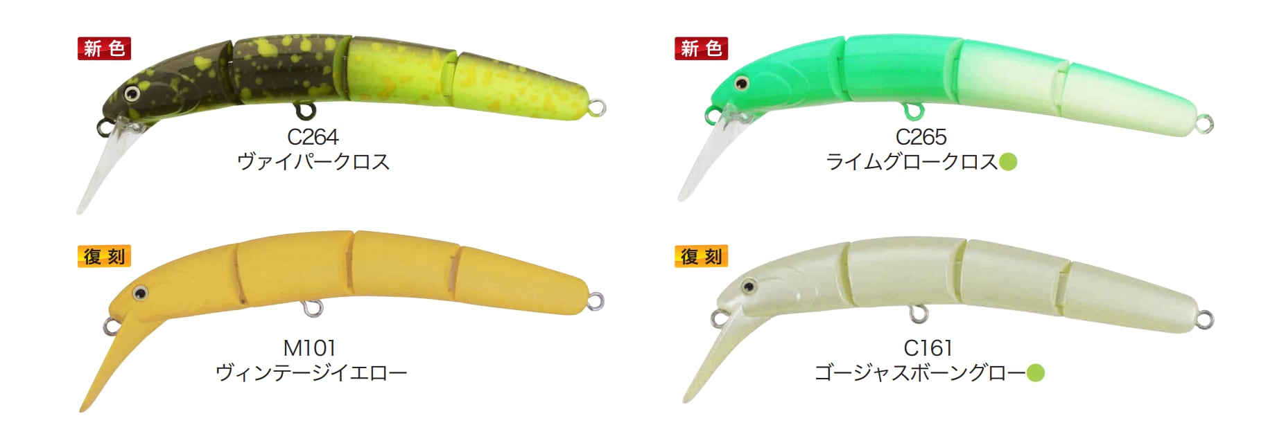 単一ボディーではだせない高次元なナチュラルアクションを生み出す為にバランス設定を極限まで追求した新スペック4連ジョイントボディーが今までにないナチュラルなライブウォブリングを生み出す!!高速リトリーブでは今までウォブリングプラグでは限界だった高速スピード領域までサーチを可能にし、タイトなウォブリングアクションでトラウトを誘う。低速リトリーブ時に最大の欠点であった速度に付随して弱くなってしまうアクションの低下を見事に克服したスローワイドなウォブリングでバイトに持ち込む。ウォブリング・ローリングに続く第3のアクションライブウォブリングがエリアトラウトの新たなる革命をもたらす!