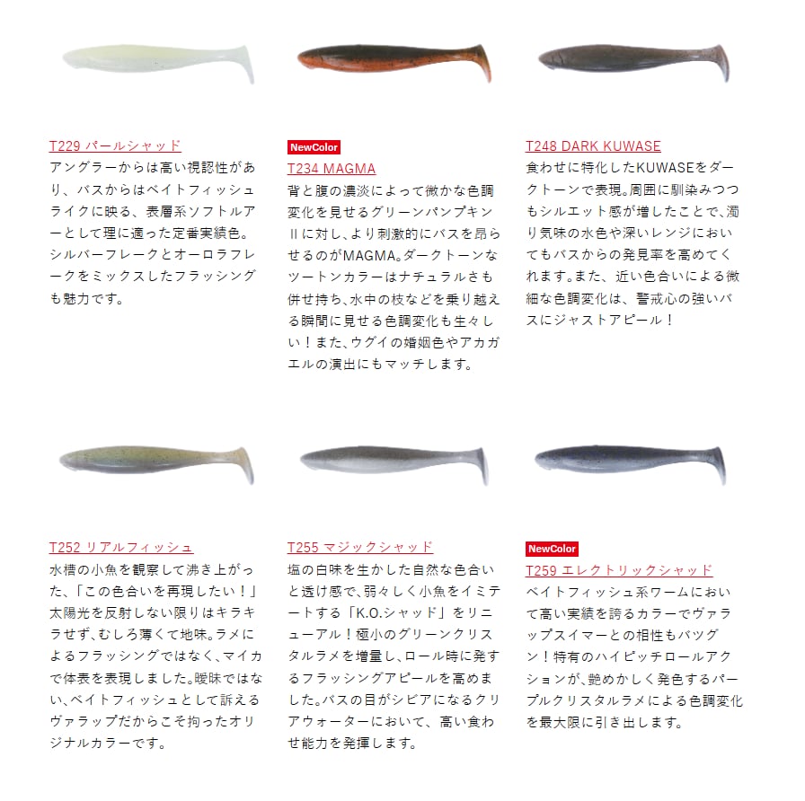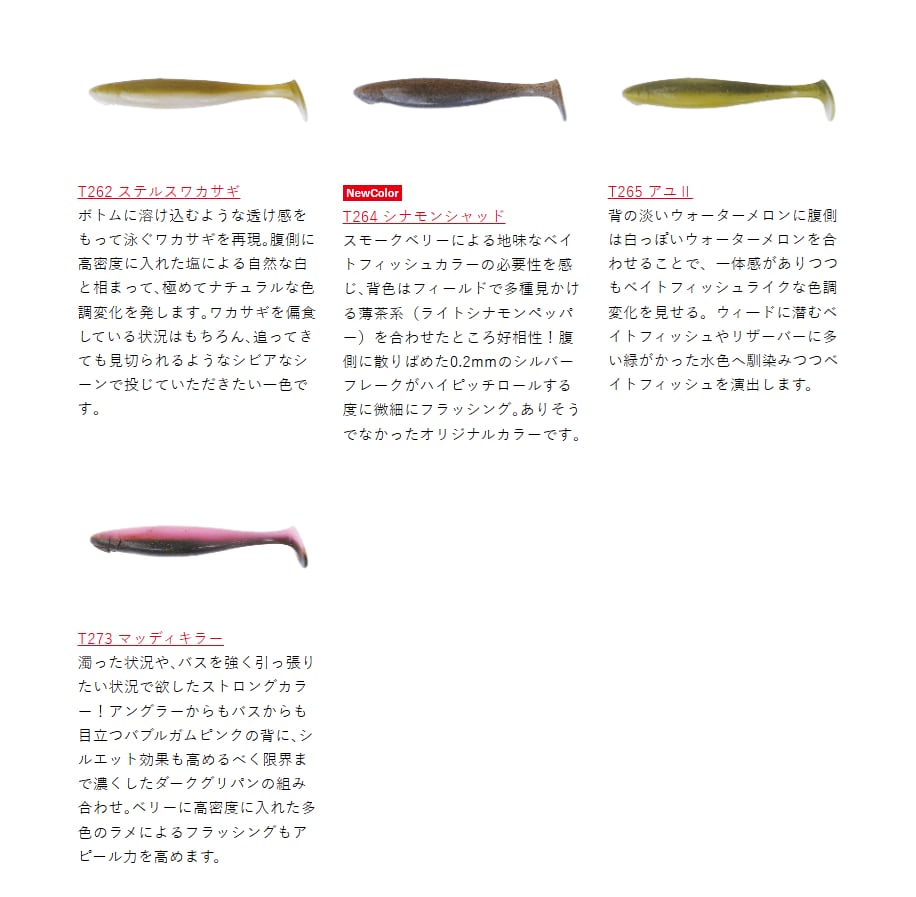 5.5インチに最適な硬度と塩の比重バランスを吟味。ヴァラップスイマーならではのハイピッチアクションを生み、快適に使える強度も備えます。また、エビ・イカ・ベイトフィッシュの粉末をトリプル配合、匂いでもバイトを促進します。