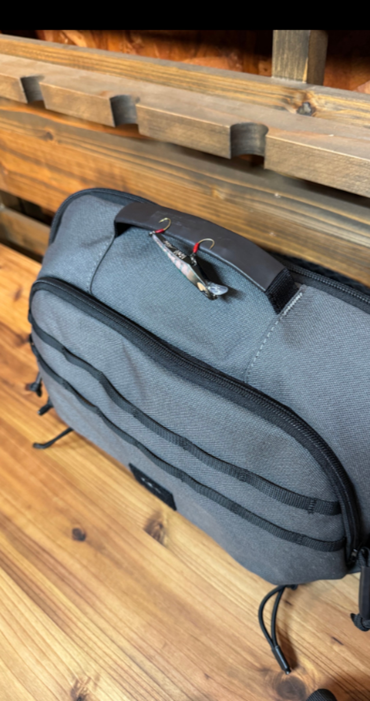 ③ルアーを一時的に保持するマグネットを2か所に設置(本体ハンドル、チェストポーチのネーム部分)