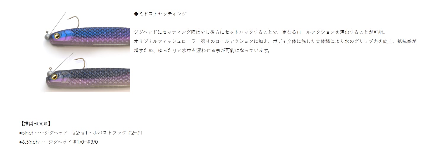スーパーフィッシュローラーは5inch・6.5inch・7.5inchの3サイズ展開。大型のベイトフィッシュを捕食しているフィールドやベイトフィッシュが大型化する秋など、フィッシュローラーとスーパーフィッシュローラーを使い分けることで様々な状況にアジャストが可能です。
