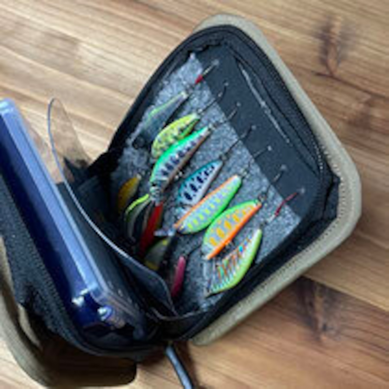 このポーチ一つに15~20個程度(50㎜ルアー)のルアーを綺麗に収納する事が出来るので、これ一つで事足りるシーンが多々あります。