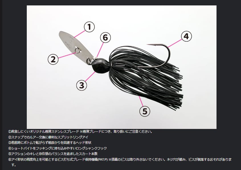 チャターベイトの強みは、強波動、強振動による “魚を呼ぶパワー”。AKチャターは “魚を呼ぶパワー” をより高めるべく、オリジナル極薄ロングブレードを搭載。効率よく水を掴むことで、ファストからスローリトリーブまで様々な速度域で釣れる振動をキープします。さらに、ブレードのポテンシャルを最大限に引き出すため、ヘッドとアイのバランスを最適化。ボディ全体をハイピッチに揺らすタイト千鳥アクションが魚を呼び、バイトに持ち込みます。安定感の高いヘッドはボトムでの転がりを減らし、着底時の根掛かりを回避。ウェイトに対して浮き上がりが良いため、ワンランク軽いチャターベイトと同じレンジをトレース可能です。ブレード保持機構には、ビス打ち式(PAT.P)を採用。従来のワイヤー曲げ込み式と比較し、アイ形状の精度向上が可能となったことで、AKチャター本来のポテンシャルを引き出すことに成功しました。